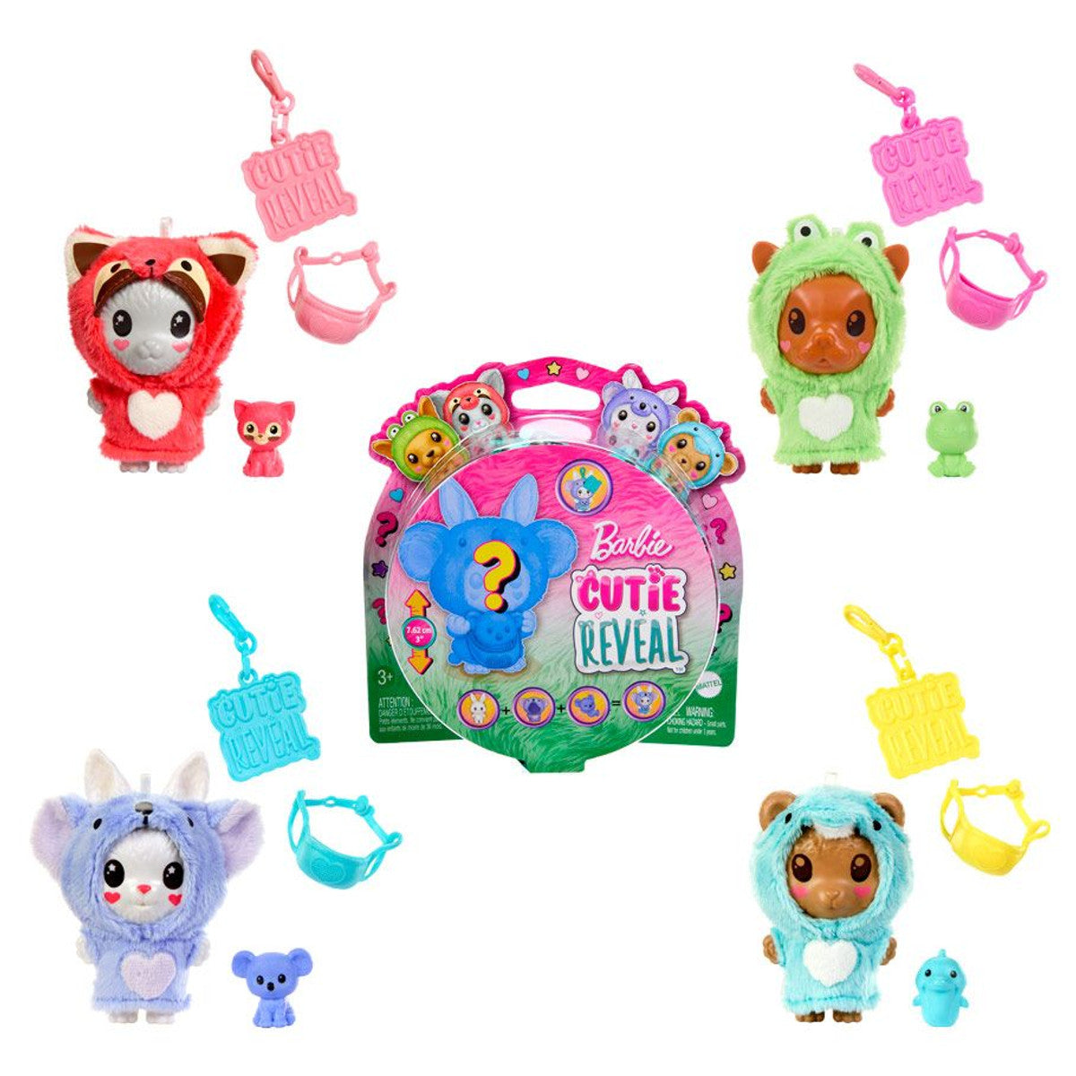 Barbie Color Reveal animal-costumed themed pets deliver an unboxing experience full of surprises -- five of them! Discover a Kitten in a Red Panda costume, a Dog as a Frog, a Teddy Bear as a Dolphin or a Bunny as a Koala. Open the surprise bags and find an even smaller, cuter pet with a carrier that attaches to the 3-inch Cutie Pet. Use the clip to take all the cuteness on the go. Discover even more wow with a color-change transformation. Which Cutie Reveal Pet will you reveal? Kids can collect them all to mix and match accessories and expand the possibilities!