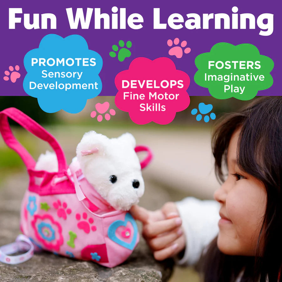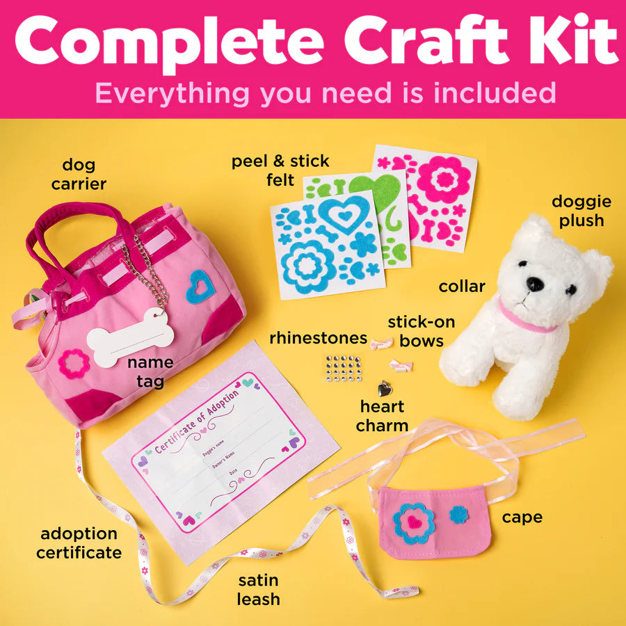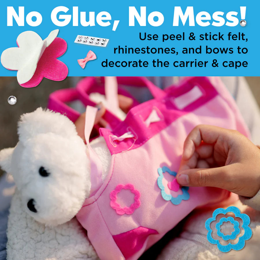 Decorate your plush doggie and pet carrier with an array of adorable accessories, including sparkle fabric stickers and patches, a BFF bracelet for you, and a BFF collar for doggie.