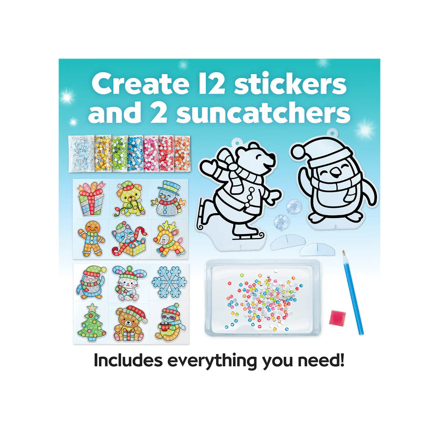 Apply your Big Gem Holiday stickers to your handmade cards, ugly Christmas sweaters, ornaments, gift tags and so much more! Display your sun catchers using the stands or included suction cups.