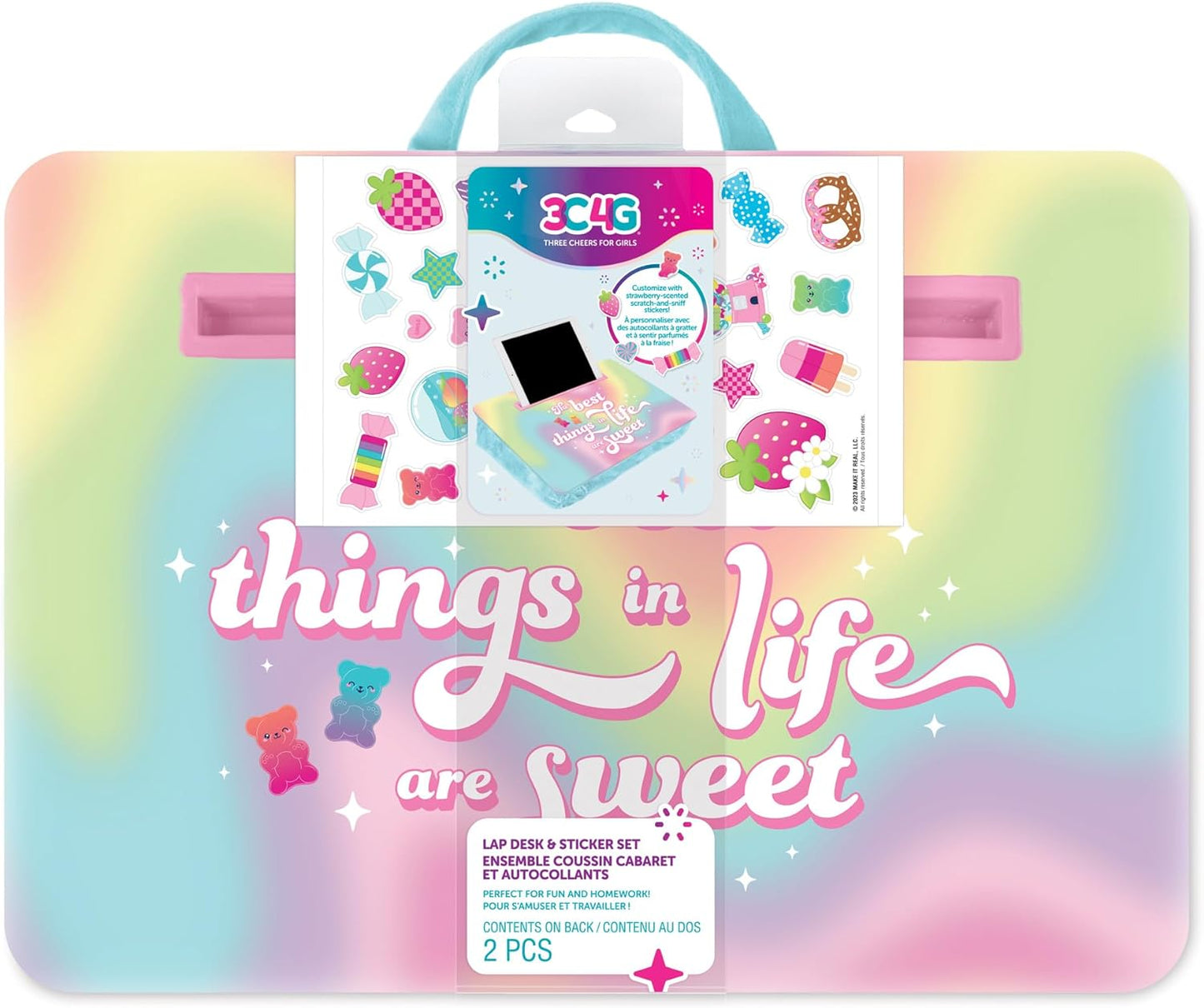 LAP DESK & STICKER SET - LIFE IS SWEET - Life is sweet when you can transform any location into a tween office! This colorful lap desk is perfect for bringing homework or doodles on the go. Make any place a cozy tween office with this portable lap desk designed with comfortable cushioning, a sturdy handle for easy transport, and a vibrant design. Personalize the lap desk with a sweet set of scratch-and-sniff stickers for extra personalization and scented fun! Focus time can happen anywhere with this lovely and practical desk. A sweet gift idea for tweens, whether for a birthday bash, holiday, or just because! Perfect for creative tweens. Ages 6+.