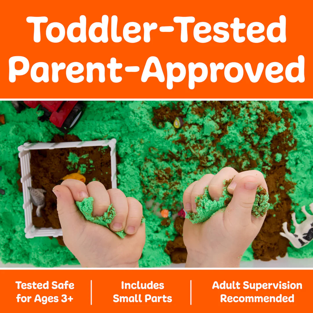 Inside, kids will find squishy sand that never dries out and over a dozen themed accessories—including 8 farm animals, a tractor, rake, vegetable charms, fences, and trees—designed for little hands and big imaginations.