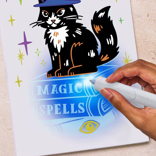 Lifelines FlowArt Pads are guided art meditations designed to help you achieve a calming flow state. Each scene is thoughtfully crafted to encourage repetitive, relaxing movements, promoting mindfulness and reducing stress. Illuminate & Create includes 20 meditative scenes and an innovative illuminating marker with 5 interchangeable colors, all in a detachable storage tray. Hover the marker's light over the page to reveal hidden, traceable scenes that create a frightfully fun surprise. Experience full immersion into this mesmerizing activity, as the illumination brings captivating detail to life, drops you into your flow, and results in a delightful scene. Compact and portable, this pad is perfect for calming your mind on-the-go, unwinding before bed, or taking a work or study break to de-stress.